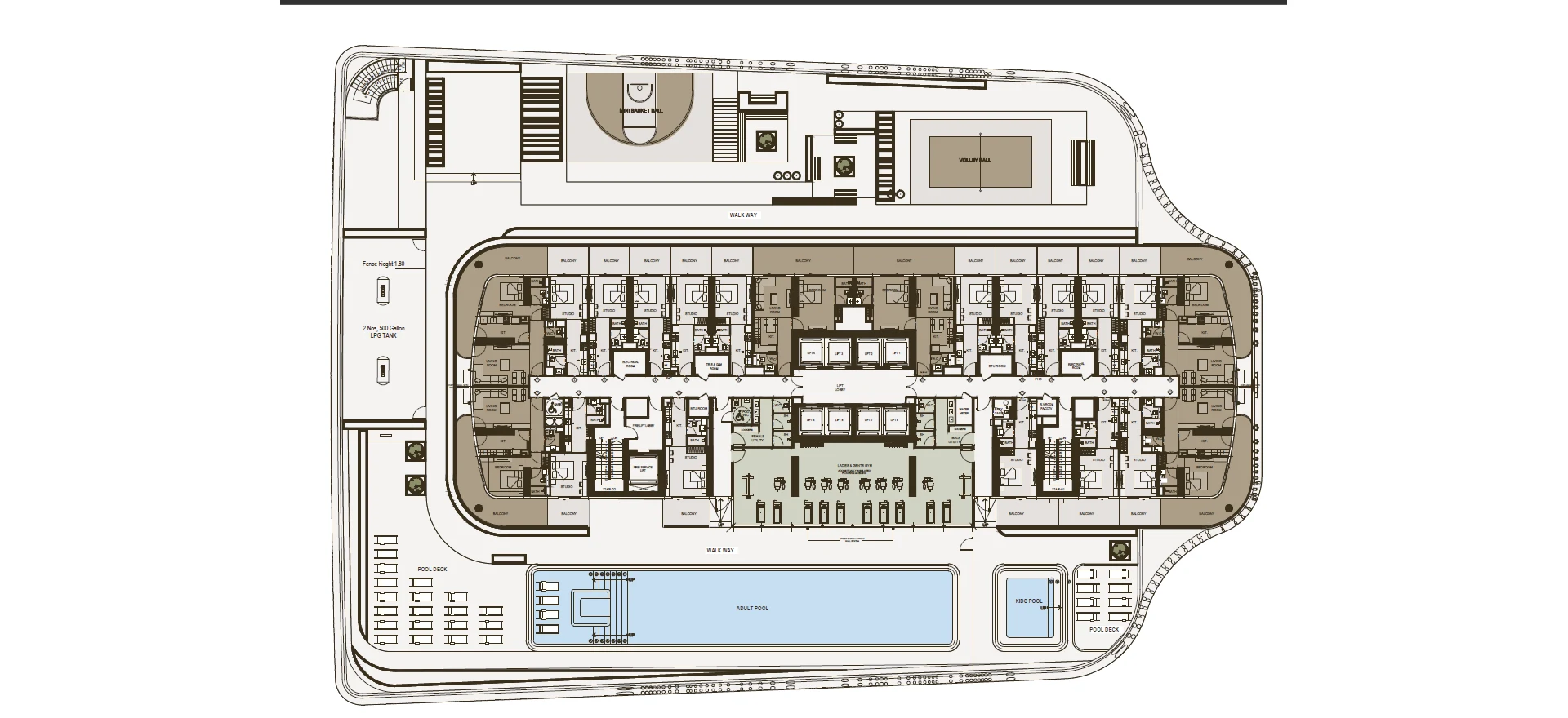 Distribuido en 1,409 acres, el desarrollo cuenta con una única torre emblemática que se eleva hasta 3B + G + 34 plantas y 717 unidades, con servicios cuidadosamente planificados que incluyen gimnasio, piscina para niños y adultos, pista para correr, zona de estar y cancha deportiva. Cada detalle está pensado para elevar el estilo de vida de Dubái.
