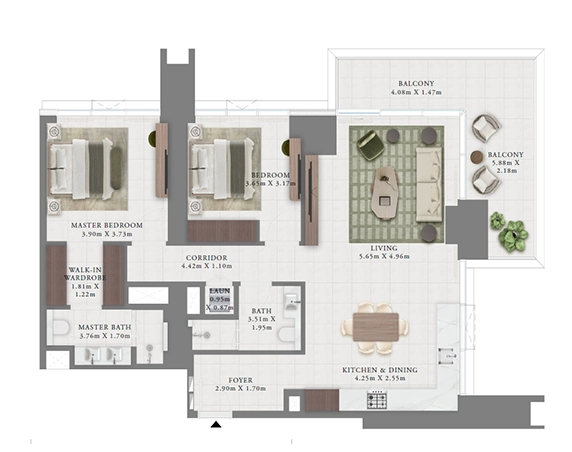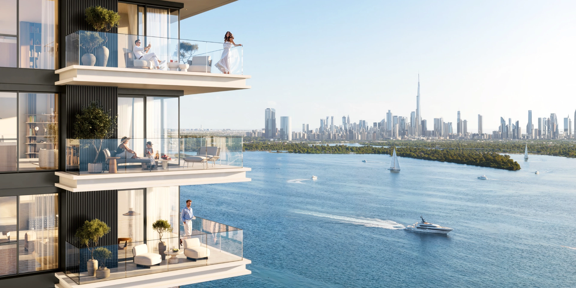 El proyecto consta de apartamentos de 1, 2 y 3 habitaciones, con superficies desde aproximadamente 735 pies cuadrados, diseñados con terrazas privadas, acristalamiento de suelo a techo y distribuciones que priorizan la luz natural y el espacio habitable. La arquitectura es intencionadamente sobria, permitiendo que la luz, el agua y la amplitud definan la experiencia en lugar de la densidad.