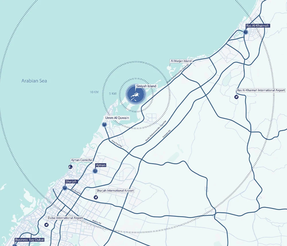 Estratégicamente ubicado cerca de la isla Al Marjan, Al Seaneeah, Dubái, Sharjah y atracciones clave, Siniya Beach Residences ofrece una conexión perfecta y un gran potencial de inversión. Con entrega prevista para diciembre de 2028, Siniya Beach Residences se erige como un símbolo de lujo moderno y brillantez arquitectónica en la codiciada costa de Umm Al Quwain.