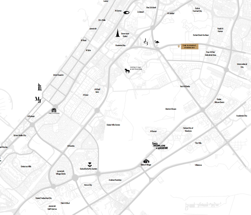 Ubicado estratégicamente cerca del Santuario de Vida Silvestre Ras Al Khor, Business Bay, Dubai Frame, Burj Khalifa, el centro de Dubái y atracciones clave, The Element of Sobha One ofrece una conectividad fluida y un gran potencial de inversión. Con entrega prevista para diciembre de 2027, The Element at Sobha One se erige como un símbolo de lujo moderno y brillantez arquitectónica en la costa más codiciada de Dubái.